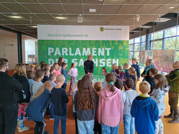 Nach 90 Minuten kamen wir in Dresden an der Semperoper an. Dort wurden die ersten Vorträge über Semperoper, Hofkirche und Residenzschloss gehalten. Danach war der Zwinger dran. Im Schloss wurde der Souvenirshop von den Schülern gestürmt, bevor wir weiter zum Fürstenzug gingen. Ein kleiner Abstecher zur Toilette in der Dresdeninformation war nun nötig. Und es ging zurück Richtung Landtag. Dort erhielten wir eine Führung, bei der viele interessante Informationen auf uns einprasselten. Wir durften auf der Besuchertribüne im Plenarsaal Platz nehmen. In einem Sitzungsraum spielten wir noch einen Gesetzgebungsprozess nach: Sollen Hausaufgaben freiwillig sein oder nicht? Die Meinung der Kinder bei der Abstimmung war klar ….